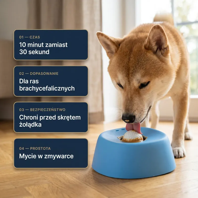 Nie obiecujemy, że miska zatrzyma każdy problem zdrowotny. Ale wolne tempo jedzenia to jeden z głównych czynników, które eliminują ryzyko skrętu. To realny argument, nie marketing.