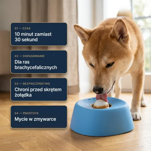 1 / 13 Twój pies je 8 razy wolniej. Bez krztuszenia, bez wymiotów. Posiłek trwa 15 minut zamiast 30 sekund.